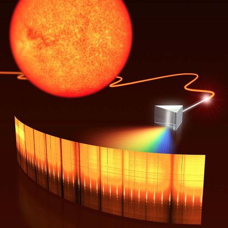 Á ljósmyndinni hér að ofan, sem er af litrófi sólar, sjást hundruð litrófslína í sólinni.
