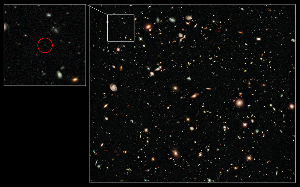 [4] Stjörnufræðingar geta fundið út og mælt fjarlægðir til fyrstu vetrarbrauta alheims með tvennum hætti. Hægt er að taka mjög djúpar myndir í gegnum mislitar síur og mæla birtu margra fyrirbæra yfir mismunandi bylgjulengdir. Svo er hægt að bera þessar upplýsingar saman við það sem búast má við af ólíkum vetrarbrautum á mismunandi tímum í sögu alheims. Þetta er eina leiðin sem við höfum til að finna mjög daufar vetrarbrautir og er það sem Hubble rannsóknarteymið studdist við. Þessi tækni er hins vegar ekki alltaf áreiðanleg. Til dæmis gæti það sem í fyrstu sýnist dauf vetrarbraut í órafjarlægð reynst venjuleg köld og dauf stjarna á stangli í okkar eigin Vetrarbraut.