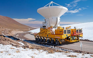 Fyrsta evrópska loftnetið í Atacama Large Millimeter/submillimeter Array (ALMA) náði nýjum hæðum er það var flutt upp í starfsstöð sjónaukans á Chajnantor sléttunni sem er í 5.000 metra hæð yfir sjávarmáli. Loftnetið er 12 metra breitt og bætist í hóp fimmtán annarra loftneta sem alþjóðlegir aðstandendur ALMA verkefnisins hafa lagt til. Loftnetin eru því orðin 16 talsins. Þótt 16 hljómi eins og hver önnur tala, þýðir hún að nú geta fyrstu vísindalegu mælingarnar hafist. Sextánda loftnetið er þess vegna afar mikilvægur áfangi. Mynd: ESO/S. Rossi