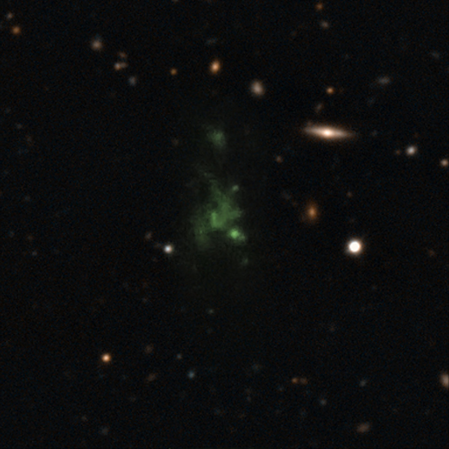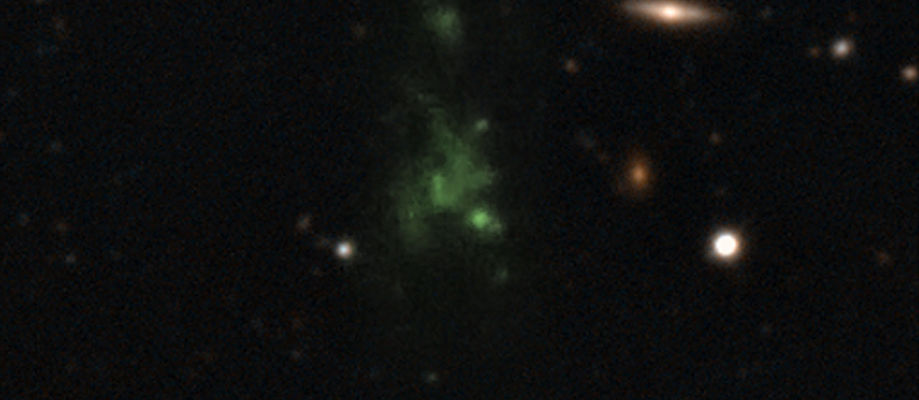Hér sést Lyman-alfa hnoðrinn LAB-1, eitt stærsta staka fyrirbæri sem þekkist í alheiminum. Myndin er sett saman úr tveimur myndum sem teknar voru með FORS mælitækinu á Very Large Telescope (VLT). Hnoðrinn sýnist grænn vegna þess að útþensla alheimsins hefur teygt á orkuríkri útfjólublárri Lyman-alfa geisluninni. Í miðju hnoðrans eru vetrarbrautir sem lýsa hann upp. Mynd: ESO/M. Hayes