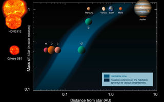 Skýringarmynd sem sýnir nokkrar reikistjörnur í lífbeltum sinna sólstjarna. Efst er sólkerfið okkar, þá HD 85512 sólkerfið og loks Gliese 581 sólkerfið. Lífbelti er það svæði í sólkerfi þar sem hitastigið er passlegt fyrir fljótandi og vatn og líf eins og við þekkjum það. Mynd: ESO