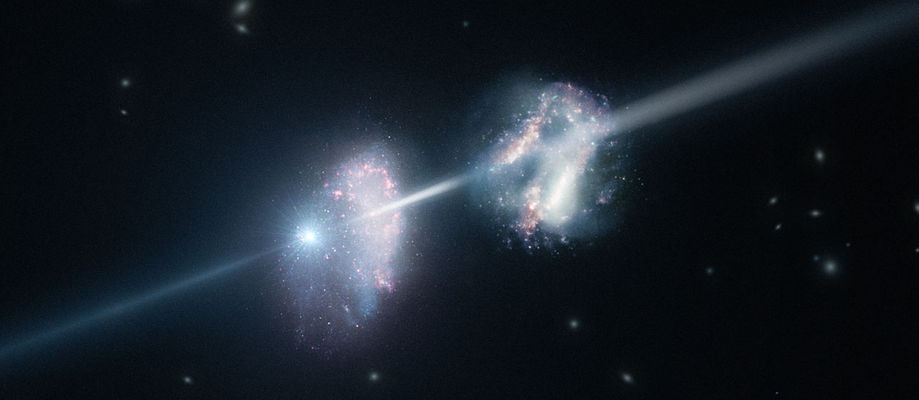 Alþjóðlegur hópur stjörnufræðinga notaði skammlíft en skært ljós frá fjarlægum gammablossa til að kanna efnasamsetningu vetrarbrauta í órafjarlægð. Mælingarnar voru gerðar með Very Large Telescope ESO og leiddu þær nokkuð mjög óvænt í ljós: Tvær vetrarbrautir í hinum unga alheimi innihalda meira magn af þungum frumefnum en sólin. Hugsanlega eru vetrarbrautirnar tvær að renna saman en slíkir atburður snemma í sögu alheimsins knýr áfram mikla nýmyndun stjarna og gæti komið af stað gammablossum.