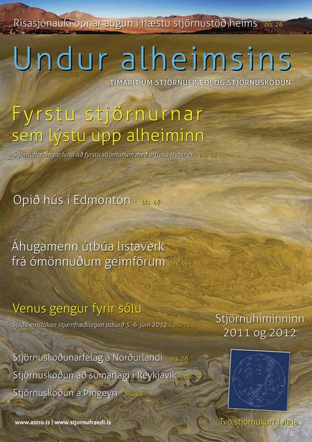 Rætt er við tvo mjög áhugasama félagsmenn sem hafa komið sér upp eigin aðstöðu til stjörnuskoðunar í görðunum sínum sitt hvoru megin á landinu, fjallað um Stjörnu-Odda félagið, nýjasta stjörnuskoðunarfélag landsins og sagt frá einstökum stjarnfræðilegum atburði sem sést frá Íslandi í júní árið 2012. Í grein sinni um opið hús í Edmonton fjallar ritari félagsins, Sverrir Guðmundsson, um kanadískt áhugafélag og það blómlega starf sem þar fer fram.