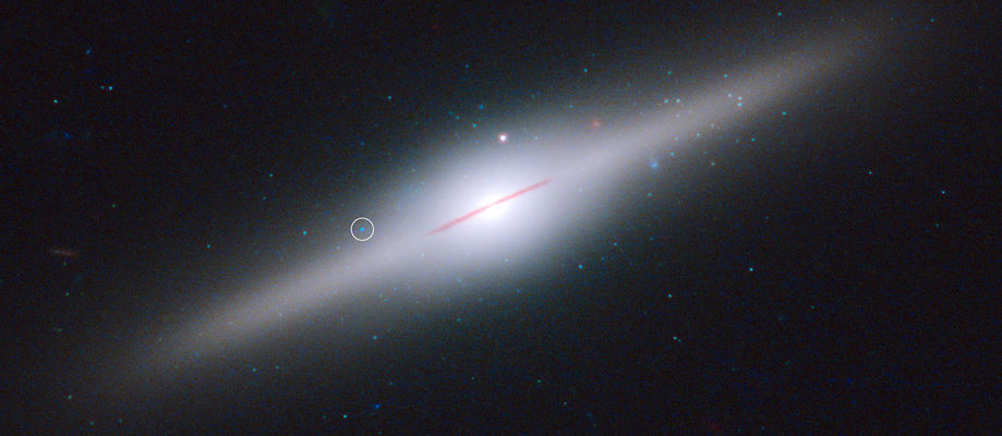 Í þessari glæsilegu vetrarbraut sem nefnist ESO 243-49 og við sjáum á rönd, er meðalstórt svarthol sem gæti verið leifar kjarna í dvergvetrarbraut sem nú er sundruð. Svartholið er 20 þúsund sinnum þyngra en sólin okkar og liggur fyrir ofan flöt vetrarbrautarinnar (merkt). Þess vegna er líklegt að svartholið sé leifar úr dvergvetrarbraut sem ESO 243-49 gleypti.