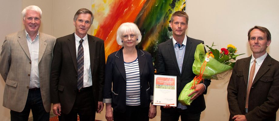 Frá vinstri til hægri: Gunnlaugur Björnsson, stjarneðlisfræðingur við HÍ; Hallgrímur Jónasson, forstöðumaður Rannís; Jóhanna Sigurðardóttir, forsætisráðherra; Páll Jakobsson handhafi Hvatningarverðlauna Vísinda- og tækniráðs 2012 og Freysteinn Sigmundsson sem var í dómnefnd. Mynd: Rannís