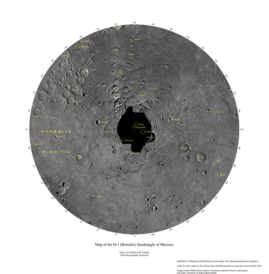 Kort af norðurpólsvæði Merkúrísar þar sem gígur hefur verið nefndur Tryggvadóttir, eftir íslensku myndlistarkonunni Nínu Tryggvadóttur. Mynd: NASA/Johns Hopkins University Applied Physics Laboratory/Carnegie Institution of Washington/USGS