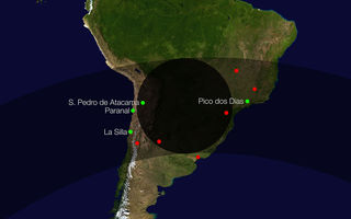 Þessi skýringarmynd sýnir skuggaferil dvergreikistjörnunnar Makemake þegar hún gekk fyrir daufa stjörnu í apríl 2011. Stjarnan hvarf í stutta stund þegar Makemake gekk fyrir stjörnuna séð frá nokkrum stöðum í Suður Ameríku, þar á meðal í La Silla og Paranal stjörnustöðvunum. Þessi dvergreikistjarna er um tveir þriðju af stærð Plútós og er lengra frá sólinni en Plútó en nær henni en Eris, massamesta þekkta dvergreikistjarna sólkerfisins. Makemake var talinn hafa lofthjúp eins og Plútó en sýnt hefur verið fram á að svo er ekki. Mynd: ESO/L. Calçada