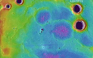 Hæðarkort frá MESSENGER af árekstrardældinni Goethe. Gígurinn Laxness er rúmlega 4 km djúpur og um 26 km breiður. Mynd: NASA/Johns Hopkins University Applied Physics Laboratory/Carnegie Institution of Washington