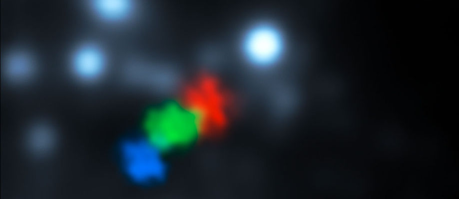 Nýjar athuganir Very Large Telescope ESO hafa í fyrsta sinn sýnt risasvartholið í miðju Vetrarbrautarinnar tæta í sig gasský. Hér sjást athuganir VLT frá árunum 2006 (blátt), 2010 (grænt) og 2013 (rautt). Vegna fjarlægðar og þeirrar staðreyndar við sjáum brautið frá bröttu sjónarhorni þegar skýið fellur að svartholinu, sést aðeins staðsetning skýsins á þessari mynd, ekki lögunin. Teyging skýsins sést kemur fram í mælingum á hraða þess og gerir stjörnufræðingum kleift að finna út hvar á brautinni mismunandi hlutar skýsins eru nú staðsettir. Mynd: ESO/S. Gillessen