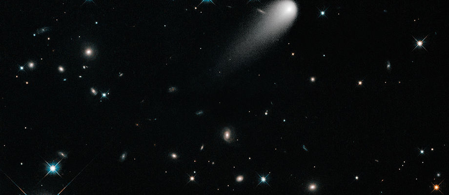 Þann 30. apríl síðastliðinn var Hubble geimsjónauka NASA og ESA beint að halastjörnunni ISON. Á myndinni sem tekin var sést halastjarnan fyrir framan aragrúa stjarna í Vetrarbrautinni okkar og fjölda fjarlægari vetrarbrauta. Halastjarnan minnir einna helst á marglyttu á sundi í hafsjó stjarnfræðilegra fyrirbæra.