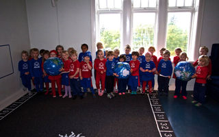 Krakkar í leikskólanum Laufásborg með Jarðarbolta. Mynd: Stjörnufræðivefurinn/Andri Ómarsson