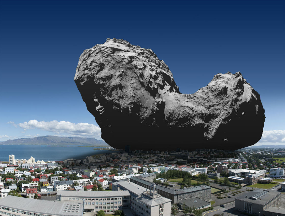 Stærð halastjörnunnar Churyumov-Gerasimenko í samanburði við Reykjavík. Mynd: Hermann Hafsteinsson/ESA