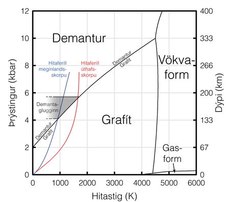 | Fasarit kolefnis, sem sýnir við hvaða hita og þrýsting demantur og grafít eru stöðug. Lóðrétti ásinn til vinstri sýnir þrýsting í kílóbörum, en eitt kílóbar samsvarar tíu þúsund sinnum meiri þrýstingi en á yfirborði jarðar. Lóðrétti ásinn til hægri sýnir samsvarandi dýpi í jörðinni, svo það sést að á 200 km dýpi er þrýstingurinn 6 kílóbör. Á lárétta ásnum er svo hitastig í kelvinum. Fasaritið sýnir vel að það þarf gríðarlegan þrýsting til að demantur verði hið stöðuga form kolefnis. Frekari lýsing í megintextaum til vinstri. Mynd: Stjörnufræðivefurinn |