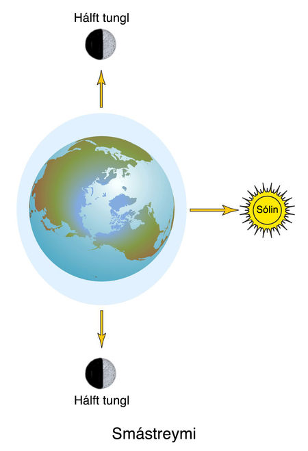 | Þegar Jörðin er hornrétt á tungl og sól vega flóðkrftar tungls og sólar á móti hvor öðrum og úr verður smástreymi. Myndin er augljóslega ekki í réttum hlutföllum. Mynd: Stjörnufræðivefurinn/W. H. Freeman |