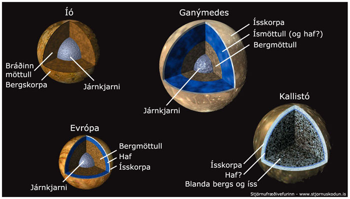 Útilokað er að vatnsís sé meginuppistaða Íó og Evrópu. Eðlismassi Íó er 3529 kg/m3, örlítið meiri en eðlismassi tunglsins, en Evrópu 3018 kg/m3. Báðir þessir eðlismassar eru dæmigerðir fyrir berg. Þess vegna drögum við þá ályktun að bæði Íó og Evrópa séu mestmegnis úr bergi.