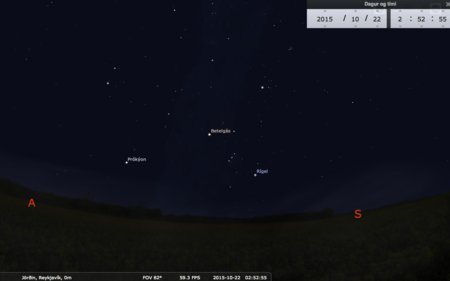 | Í október rís Óríon upp á himininn um miðnætti. Mynd: Stjörnufræðivefurinn/Stellarium |