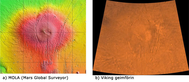| Alba Patera er mjög flatt fjall en þó risastórt og fellur vel inn í umhverfið á mynd b) sem sett er saman úr myndum sem Viking geimförin tóku árið 1976. Mynd a) sýnir fjallið betur enda hæðarkort frá MOLA. |