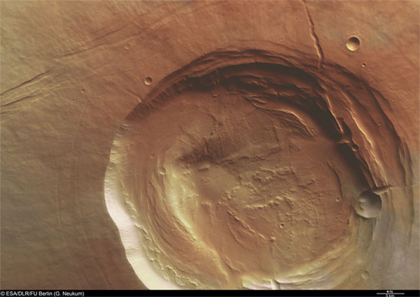 | Þessa mynd tók Mars Express geimfarið af öskju Biblis Patera. Útlit öskjunnar bendir til þess að hún hafi hrunið nokkrum sinnum. Sprungurnar eða sigdældirnar í öskjunni hafa líklega myndast við landris Þarsis. |