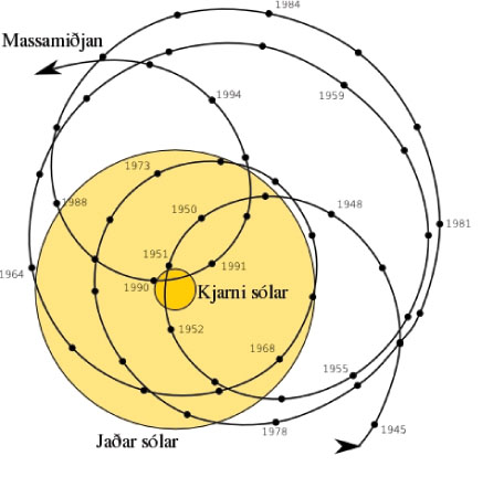 | Mynd 2. Hreyfing massamiðju sólkerfisins vegna áhrifa frá reikistjörnunum yfir hálfa öld frá 1945 til 1995. Hreyfingin er flókin þar sem reikistjörnurnar hafa mismikil áhrif eftir massa og fjarlægð frá sól. |