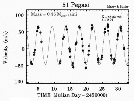 Með sömu aðferð staðfestu stjörnufræðingarnir Geoff Marcy og Paul Butler tilvist 51 Pegasi b aðeins sex dögum síðar. Notuðu þeir til þess Hamilton litrófssjánna við Lick stjörnustöðina í San Jose í Kaliforníu. Hér undir sést sjónstefnuhraði stjörnunnar í m/s sem fall af tíma. Sveiflurnar eru af völdum reikistjörnunnar.