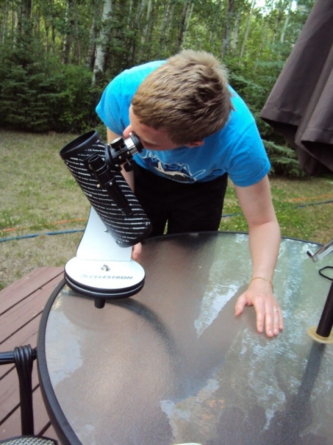 | Prófaðu sjónaukann að degi til. Hér prófar Sverrir Guðmundsson Celestron FirstScope sjónaukann sinn um hábjartan dag. Mynd: Sverrir Guðmundsson |