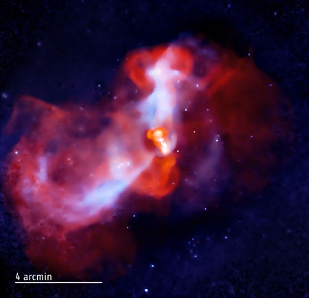 | Messier 87 í útvarps- og röntgengeislun. Á myndinni sést kalt gas í Meyjarþyrpingunni falla í átt að kjarna M87. Þar mætir það afstæðilegum stróki frá svartholinu og myndast þá höggbylgjur miðgeimsefni vetrarbrautarinnar. Mynd: NASA/CXC/KIPAC/N. Werner, E. Million et al) (NRAO/AUI/NSF/F. Owen |