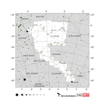 | Stjörnumerkið Fljótið og nágrenni. Mynd úr Stellarium hugbúnaðinum |