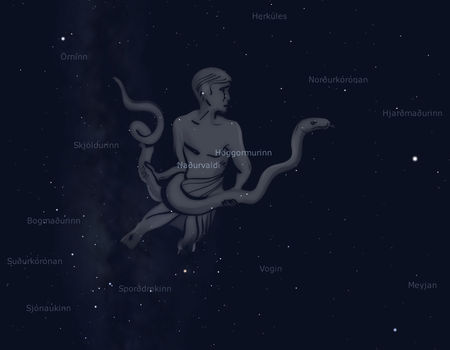 | Stjörnumerkið Höggormurinn og nágrenni. Mynd úr Stellarium hugbúnaðinum |